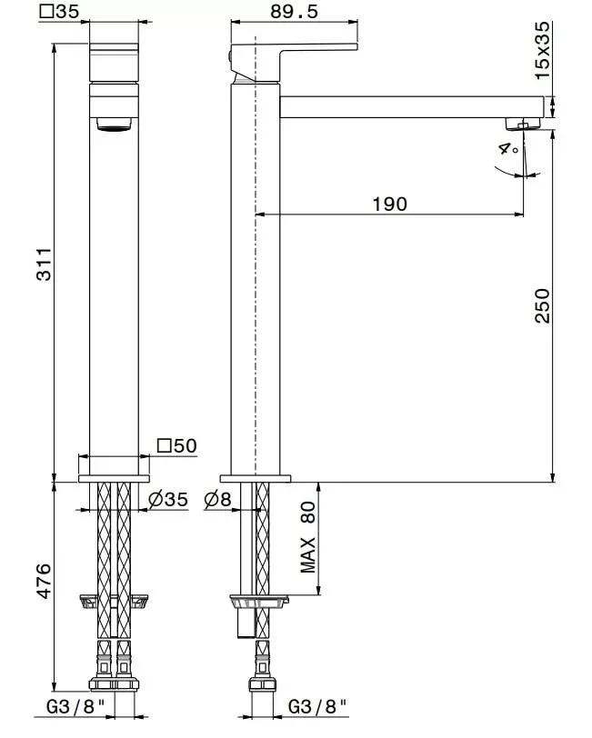 Смеситель для раковины FUTURA однорычажный высокий без донного клапана 3/8, матовый черный
