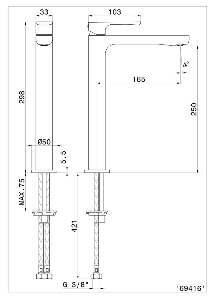 Смеситель для раковины OLE однорычажный высокий без донного клапана, золотой атласный